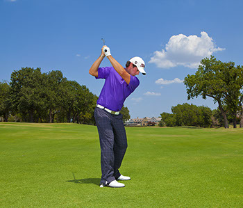 2. Swing to the top of your backswing, while you transfer around 80-percent of your weight to your back foot.