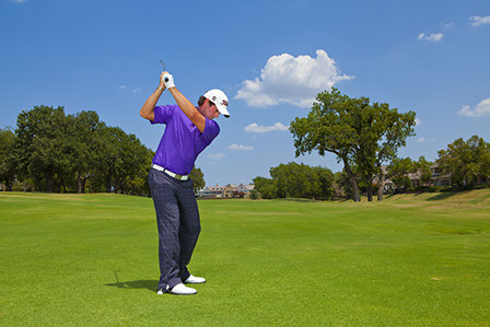 2. Swing to the top of your backswing, while you transfer around 80-percent of your weight to your back foot.